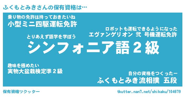 ふくもとみきさんの保有資格は… とりあえず語学を学ぼう『シンフォニア語2級』乗り物の免許は持っておきたいね『小型ミニ四駆運転免許』自分の資格をつくったー『ふくもとみき流相撲 五段』 ツクッター #保有資格ツクッター http://tkutter.nan7.net/shikaku/104679/