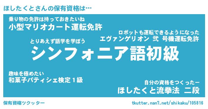 ほしたくとさんの保有資格は… とりあえず語学を学ぼう『シンフォニア語初級』乗り物の免許は持っておきたいね『小型マリオカート運転免許』自分の資格をつくったー『ほしたくと流拳法 二段』 ツクッター #保有資格ツクッター http://tkutter.nan7.net/shikaku/105816/