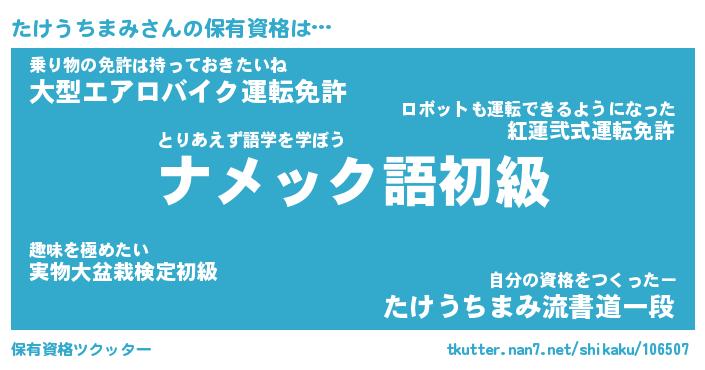 | ヒーロー風カッコイイあだ名 | 『スーパータケウチマミ』『天弓騎士タケ』 |
