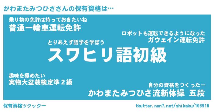 | 肩書あだ名 | 『かわまたみつひさ御曹司』 |