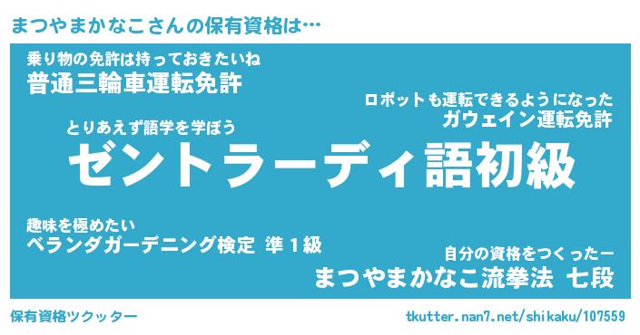 まつやまかなこさんの保有資格は… とりあえず語学を学ぼう『ゼントラーディ語初級』乗り物の免許は持っておきたいね『普通三輪車運転免許』自分の資格をつくったー『まつやまかなこ流拳法 七段』 ツクッター #保有資格ツクッター http://tkutter.nan7.net/shikaku/107559/