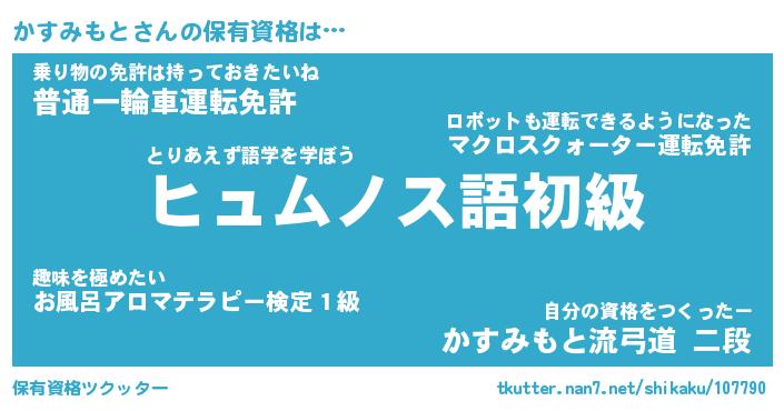 かすみもとさんの保有資格は… とりあえず語学を学ぼう『ヒュムノス語初級』乗り物の免許は持っておきたいね『普通一輪車運転免許』自分の資格をつくったー『かすみもと流弓道 二段』 ツクッター #保有資格ツクッター http://tkutter.nan7.net/shikaku/107790/