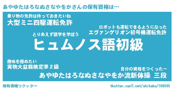 | 伝説のあだ名 | 『封印されしスナイパーあやゆたはろなぬさなやをか』 |