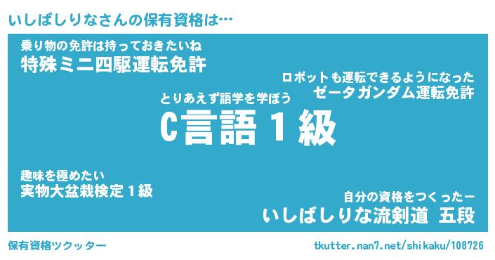 いしばしりなさんの保有資格は… とりあえず語学を学ぼう『C言語1級』乗り物の免許は持っておきたいね『特殊ミニ四駆運転免許』自分の資格をつくったー『いしばしりな流剣道 五段』 ツクッター #保有資格ツクッター http://tkutter.nan7.net/shikaku/108726/