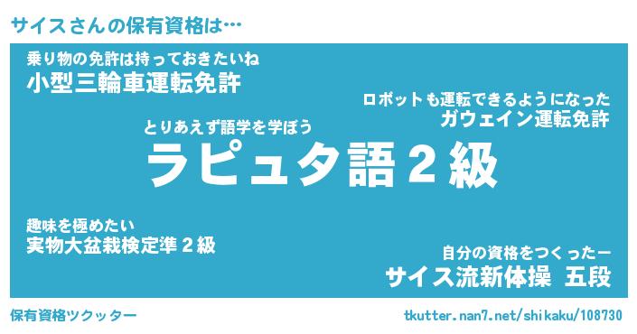 サイスさんの保有資格は… とりあえず語学を学ぼう『ラピュタ語2級』乗り物の免許は持っておきたいね『小型三輪車運転免許』自分の資格をつくったー『サイス流新体操 五段』 ツクッター #保有資格ツクッター http://tkutter.nan7.net/shikaku/108730/