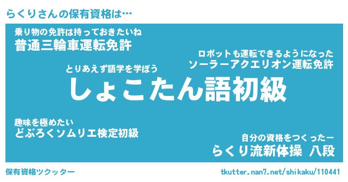 らくりさんの保有資格は… とりあえず語学を学ぼう『しょこたん語初級』乗り物の免許は持っておきたいね『普通三輪車運転免許』自分の資格をつくったー『らくり流新体操 八段』 ツクッター #保有資格ツクッター http://tkutter.nan7.net/shikaku/110441/
