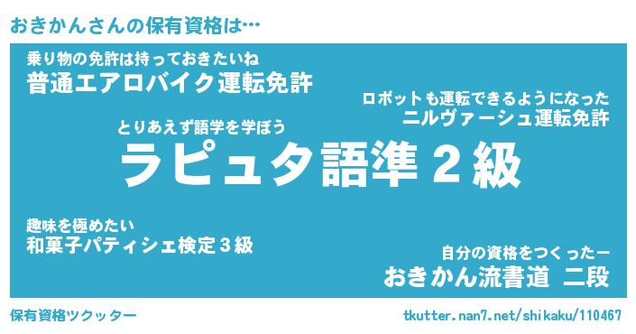 おきかんさんの保有資格は… とりあえず語学を学ぼう『ラピュタ語準2級』乗り物の免許は持っておきたいね『普通エアロバイク運転免許』自分の資格をつくったー『おきかん流書道 二段』 ツクッター #保有資格ツクッター http://tkutter.nan7.net/shikaku/110467/