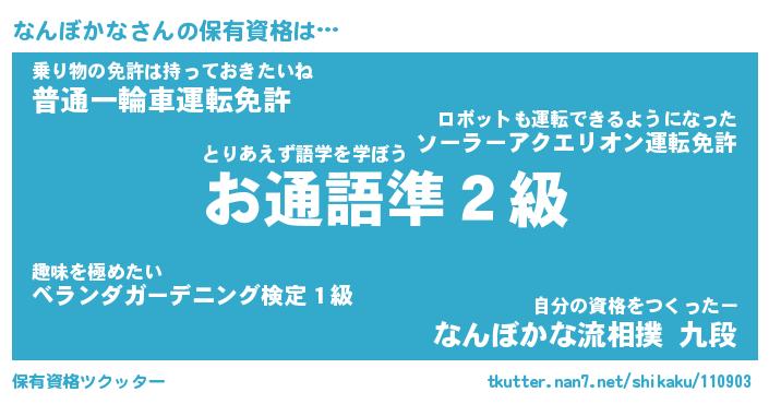 なんぼかなさんの保有資格は… とりあえず語学を学ぼう『お通語準2級』乗り物の免許は持っておきたいね『普通一輪車運転免許』自分の資格をつくったー『なんぼかな流相撲 九段』 ツクッター #保有資格ツクッター http://tkutter.nan7.net/shikaku/110903/