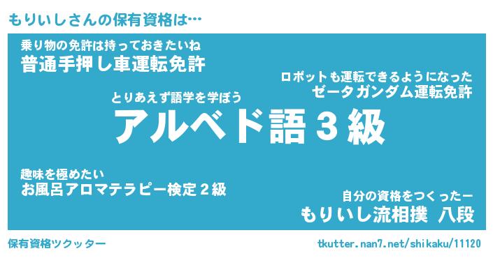 もりいしさんの保有資格は… とりあえず語学を学ぼう『アルベド語3級』乗り物の免許は持っておきたいね『普通手押し車運転免許』自分の資格をつくったー『もりいし流相撲 八段』 ツクッター #保有資格ツクッター http://tkutter.nan7.net/shikaku/11120/
