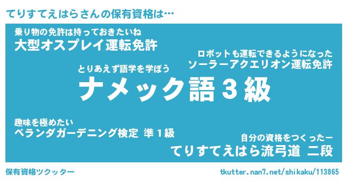 てりすてえはらさんの保有資格は… とりあえず語学を学ぼう『ナメック語3級』乗り物の免許は持っておきたいね『大型オスプレイ運転免許』自分の資格をつくったー『てりすてえはら流弓道 二段』 ツクッター #保有資格ツクッター http://tkutter.nan7.net/shikaku/113865/