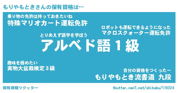 もりやもときさんの保有資格は… とりあえず語学を学ぼう『アルベド語1級』乗り物の免許は持っておきたいね『特殊マリオカート運転免許』自分の資格をつくったー『もりやもとき流書道 九段』 ツクッター #保有資格ツクッター http://tkutter.nan7.net/shikaku/116324/