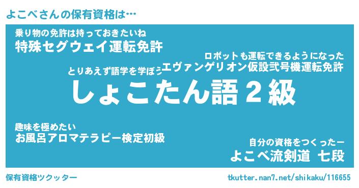 よこべさんの保有資格は… とりあえず語学を学ぼう『しょこたん語2級』乗り物の免許は持っておきたいね『特殊セグウェイ運転免許』自分の資格をつくったー『よこべ流剣道 七段』 ツクッター #保有資格ツクッター http://tkutter.nan7.net/shikaku/116655/