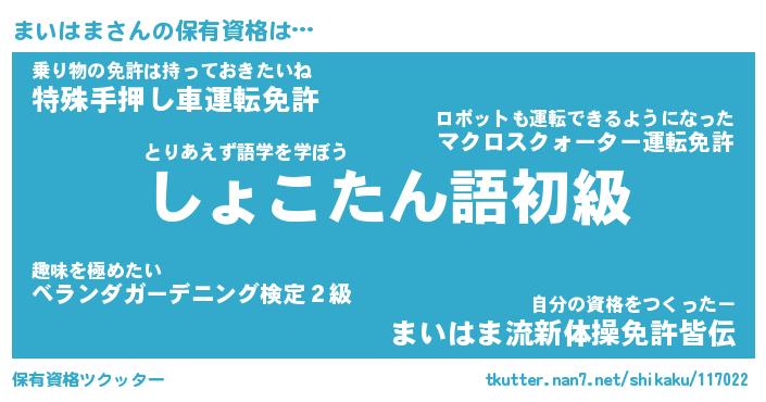 まいはまさんの保有資格は… とりあえず語学を学ぼう『しょこたん語初級』乗り物の免許は持っておきたいね『特殊手押し車運転免許』自分の資格をつくったー『まいはま流新体操免許皆伝』 ツクッター #保有資格ツクッター http://tkutter.nan7.net/shikaku/117022/