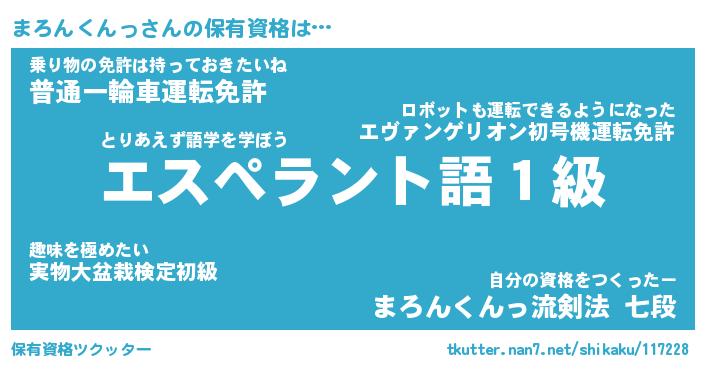 まろんくんっさんの保有資格は… とりあえず語学を学ぼう『エスペラント語1級』乗り物の免許は持っておきたいね『普通一輪車運転免許』自分の資格をつくったー『まろんくんっ流剣法 七段』 ツクッター #保有資格ツクッター http://tkutter.nan7.net/shikaku/117228/