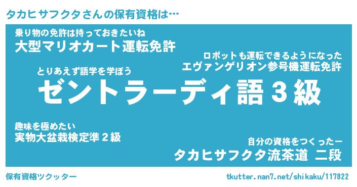タカヒサフクタさんの保有資格は… とりあえず語学を学ぼう『ゼントラーディ語3級』乗り物の免許は持っておきたいね『大型マリオカート運転免許』自分の資格をつくったー『タカヒサフクタ流茶道 二段』 ツクッター #保有資格ツクッター http://tkutter.nan7.net/shikaku/117822/