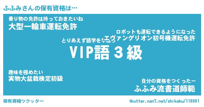 ふふみさんの保有資格は… とりあえず語学を学ぼう『 VIP語3級』乗り物の免許は持っておきたいね『大型一輪車運転免許』自分の資格をつくったー『ふふみ流書道師範』 ツクッター #保有資格ツクッター http://tkutter.nan7.net/shikaku/118081/