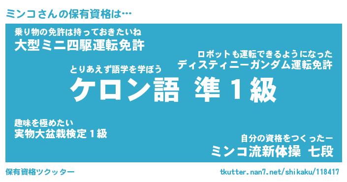 ミンコさんの保有資格は… とりあえず語学を学ぼう『ケロン語 準1級』乗り物の免許は持っておきたいね『大型ミニ四駆運転免許』自分の資格をつくったー『ミンコ流新体操 七段』 ツクッター #保有資格ツクッター http://tkutter.nan7.net/shikaku/118417/
