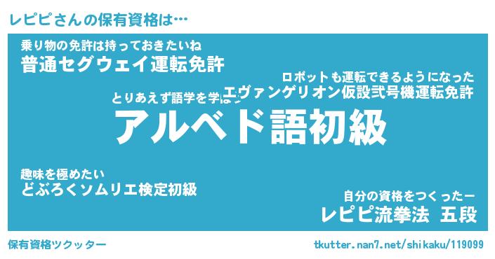 レピピさんの保有資格は… とりあえず語学を学ぼう『アルベド語初級』乗り物の免許は持っておきたいね『普通セグウェイ運転免許』自分の資格をつくったー『レピピ流拳法 五段』 ツクッター #保有資格ツクッター http://tkutter.nan7.net/shikaku/119099/