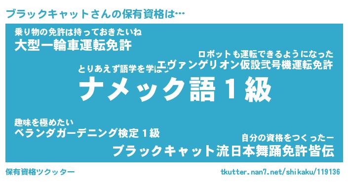 ブラックキャットさんの保有資格は… とりあえず語学を学ぼう『ナメック語1級』乗り物の免許は持っておきたいね『大型一輪車運転免許』自分の資格をつくったー『ブラックキャット流日本舞踊免許皆伝』 ツクッター #保有資格ツクッター http://tkutter.nan7.net/shikaku/119136/