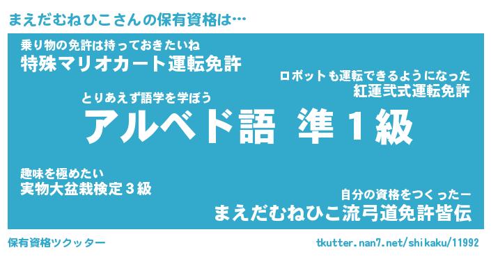 まえだむねひこさんの保有資格は… とりあえず語学を学ぼう『アルベド語 準1級』乗り物の免許は持っておきたいね『特殊マリオカート運転免許』自分の資格をつくったー『まえだむねひこ流弓道免許皆伝』 ツクッター #保有資格ツクッター http://tkutter.nan7.net/shikaku/11992/