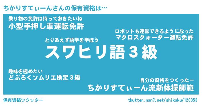 ちかりすてぃーんさんの保有資格は… とりあえず語学を学ぼう『スワヒリ語3級』乗り物の免許は持っておきたいね『小型手押し車運転免許』自分の資格をつくったー『ちかりすてぃーん流新体操師範』 ツクッター #保有資格ツクッター http://tkutter.nan7.net/shikaku/120353/