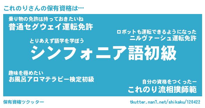 これのりさんの保有資格は… とりあえず語学を学ぼう『シンフォニア語初級』乗り物の免許は持っておきたいね『普通セグウェイ運転免許』自分の資格をつくったー『これのり流相撲師範』 ツクッター #保有資格ツクッター http://tkutter.nan7.net/shikaku/120422/