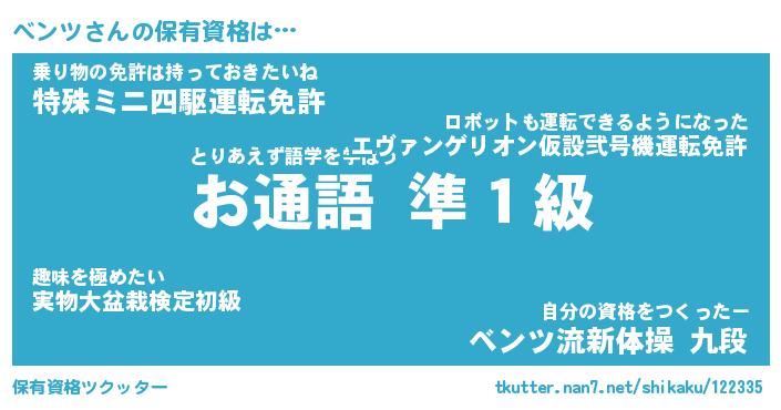 ベンツさんの保有資格は… とりあえず語学を学ぼう『お通語 準1級』乗り物の免許は持っておきたいね『特殊ミニ四駆運転免許』自分の資格をつくったー『ベンツ流新体操 九段』 ツクッター #保有資格ツクッター http://tkutter.nan7.net/shikaku/122335/