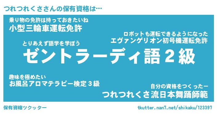つれつれくささんの保有資格は… とりあえず語学を学ぼう『ゼントラーディ語2級』乗り物の免許は持っておきたいね『小型三輪車運転免許』自分の資格をつくったー『つれつれくさ流日本舞踊師範』 ツクッター #保有資格ツクッター http://tkutter.nan7.net/shikaku/123397/