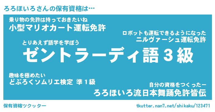 ろろほいろさんの保有資格は… とりあえず語学を学ぼう『ゼントラーディ語3級』乗り物の免許は持っておきたいね『小型マリオカート運転免許』自分の資格をつくったー『ろろほいろ流日本舞踊免許皆伝』 ツクッター #保有資格ツクッター http://tkutter.nan7.net/shikaku/123471/