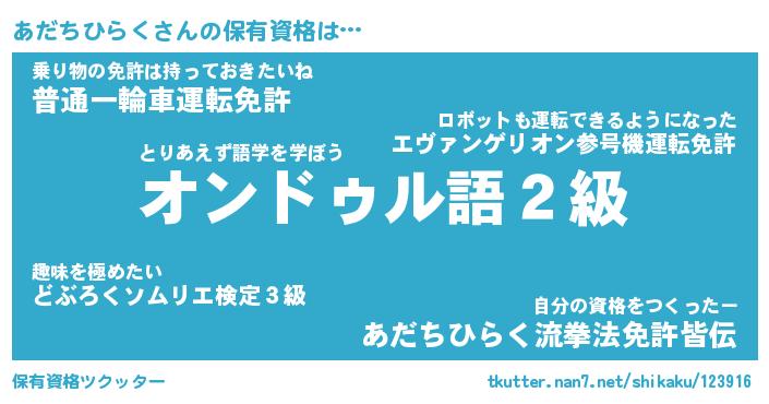 あだちひらくさんの保有資格は… とりあえず語学を学ぼう『オンドゥル語2級』乗り物の免許は持っておきたいね『普通一輪車運転免許』自分の資格をつくったー『あだちひらく流拳法免許皆伝』 ツクッター #保有資格ツクッター http://tkutter.nan7.net/shikaku/123916/