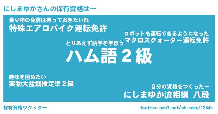 | 肩書あだ名 | 『にしまゆかCEO』『にしまゆか大統領』 |