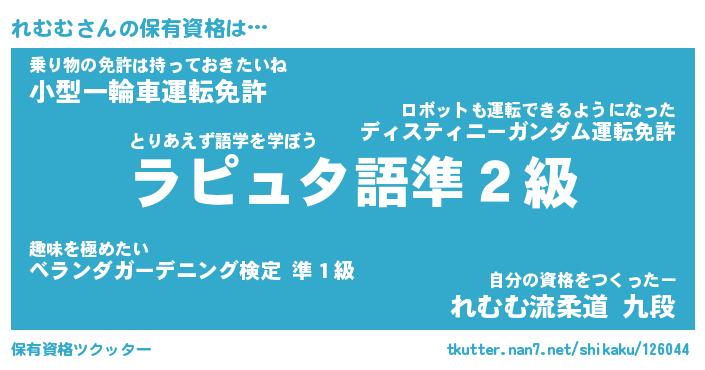 れむむさんの保有資格は… とりあえず語学を学ぼう『ラピュタ語準2級』乗り物の免許は持っておきたいね『小型一輪車運転免許』自分の資格をつくったー『れむむ流柔道 九段』 ツクッター #保有資格ツクッター http://tkutter.nan7.net/shikaku/126044/