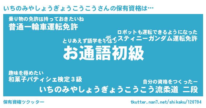 | 男性向けラノベタイトル風あだ名 | 『いちのみやしょうぎょうこうこうの憂鬱』 |