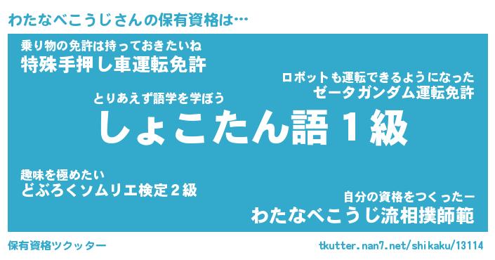わたなべこうじさんの保有資格は… とりあえず語学を学ぼう『しょこたん語1級』乗り物の免許は持っておきたいね『特殊手押し車運転免許』自分の資格をつくったー『わたなべこうじ流相撲師範』 ツクッター #保有資格ツクッター http://tkutter.nan7.net/shikaku/13114/