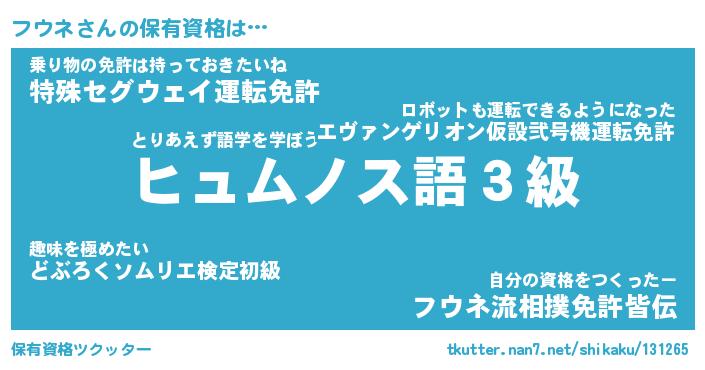 フウネさんの保有資格は… とりあえず語学を学ぼう『ヒュムノス語3級』乗り物の免許は持っておきたいね『特殊セグウェイ運転免許』自分の資格をつくったー『フウネ流相撲免許皆伝』 ツクッター #保有資格ツクッター http://tkutter.nan7.net/shikaku/131265/