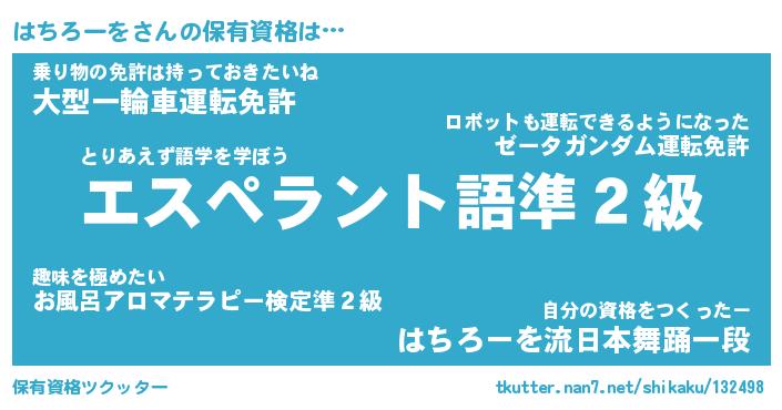 はちろーをさんの保有資格は… とりあえず語学を学ぼう『エスペラント語準2級』乗り物の免許は持っておきたいね『大型一輪車運転免許』自分の資格をつくったー『はちろーを流日本舞踊一段』 ツクッター #保有資格ツクッター http://tkutter.nan7.net/shikaku/132498/