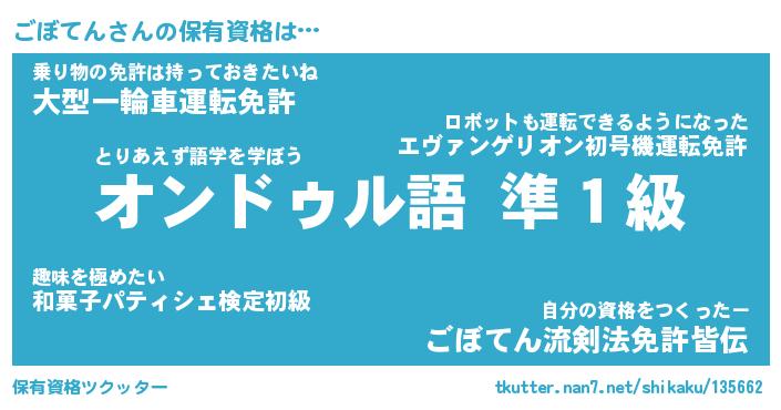 ごぼてんさんの保有資格は… とりあえず語学を学ぼう『オンドゥル語 準1級』乗り物の免許は持っておきたいね『大型一輪車運転免許』自分の資格をつくったー『ごぼてん流剣法免許皆伝』 ツクッター #保有資格ツクッター http://tkutter.nan7.net/shikaku/135662/