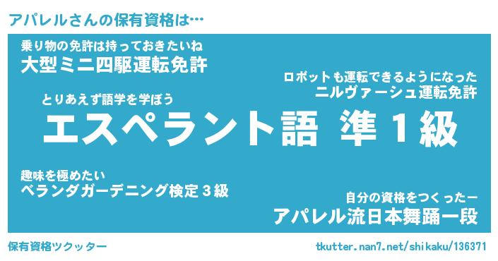 アパレルさんの保有資格は… とりあえず語学を学ぼう『エスペラント語 準1級』乗り物の免許は持っておきたいね『大型ミニ四駆運転免許』自分の資格をつくったー『アパレル流日本舞踊一段』 ツクッター #保有資格ツクッター http://tkutter.nan7.net/shikaku/136371/
