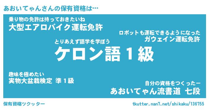 あおいてゃんさんの保有資格は… とりあえず語学を学ぼう『ケロン語1級』乗り物の免許は持っておきたいね『大型エアロバイク運転免許』自分の資格をつくったー『あおいてゃん流書道 七段』 ツクッター #保有資格ツクッター http://tkutter.nan7.net/shikaku/136755/