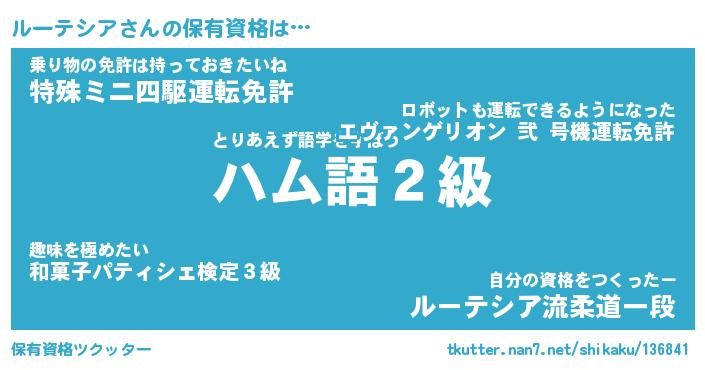 ルーテシアさんの保有資格は… とりあえず語学を学ぼう『ハム語2級』乗り物の免許は持っておきたいね『特殊ミニ四駆運転免許』自分の資格をつくったー『ルーテシア流柔道一段』 ツクッター #保有資格ツクッター http://tkutter.nan7.net/shikaku/136841/