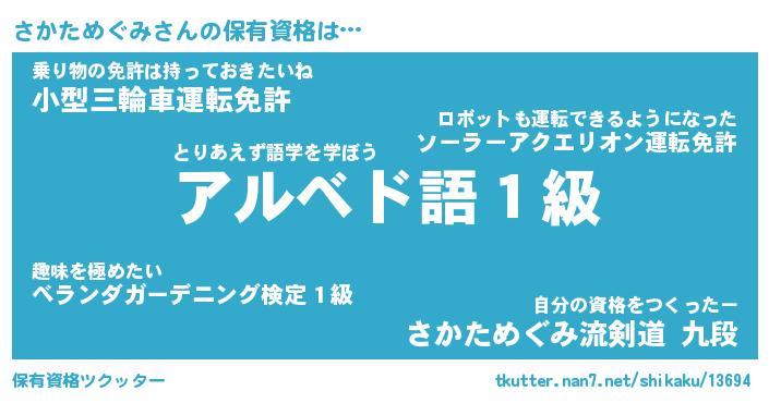 | 女子向けラノベタイトル風あだ名 | 『さかためぐみ姫と円卓の騎士』 |