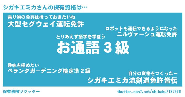 | ヒーロー風カッコイイあだ名 | 『スーパーシガキエミカ』『魔戒騎士シガ』 |