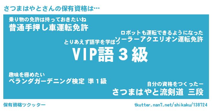 さつまはやとさんの保有資格は… とりあえず語学を学ぼう『 VIP語3級』乗り物の免許は持っておきたいね『普通手押し車運転免許』自分の資格をつくったー『さつまはやと流剣道 三段』 ツクッター #保有資格ツクッター http://tkutter.nan7.net/shikaku/138724/