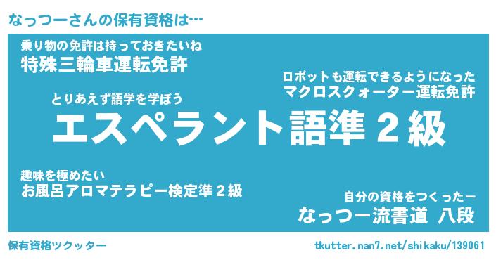 なっつーさんの保有資格は… とりあえず語学を学ぼう『エスペラント語準2級』乗り物の免許は持っておきたいね『特殊三輪車運転免許』自分の資格をつくったー『なっつー流書道 八段』 ツクッター #保有資格ツクッター http://tkutter.nan7.net/shikaku/139061/