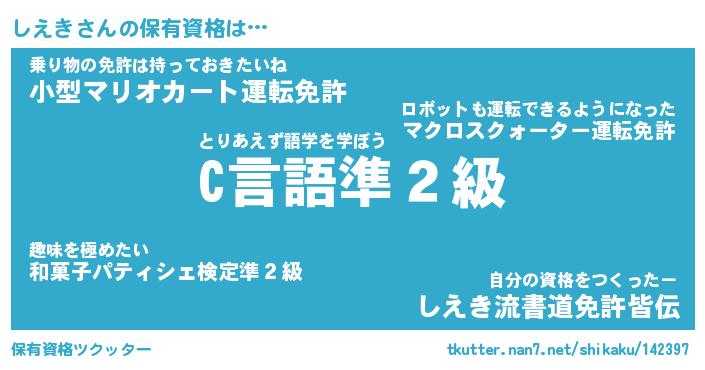 しえきさんの保有資格は… とりあえず語学を学ぼう『C言語準2級』乗り物の免許は持っておきたいね『小型マリオカート運転免許』自分の資格をつくったー『しえき流書道免許皆伝』 ツクッター #保有資格ツクッター http://tkutter.nan7.net/shikaku/142397/