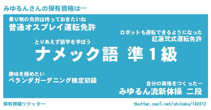 みゆるんさんの保有資格は… とりあえず語学を学ぼう『ナメック語 準1級』乗り物の免許は持っておきたいね『普通オスプレイ運転免許』自分の資格をつくったー『みゆるん流新体操 二段』 ツクッター #保有資格ツクッター http://tkutter.nan7.net/shikaku/142812/