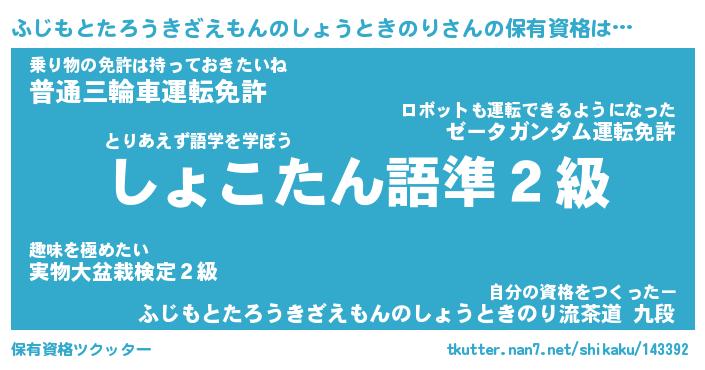 | ツイッター | ふじもとたろうきざえもんのしょうときのりさんのツイッターID『namakemono_kun』 |