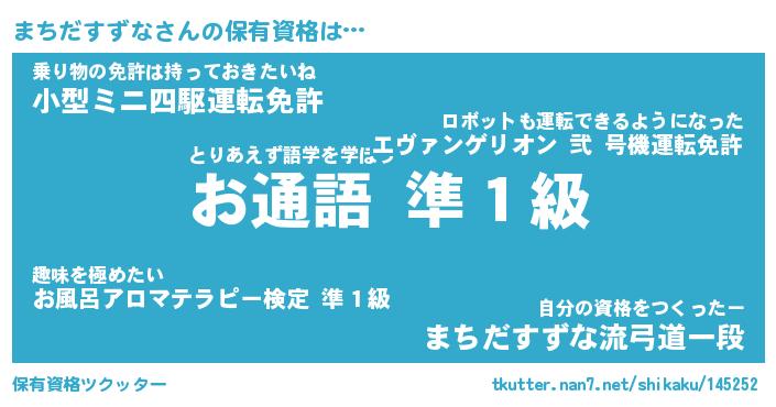まちだすずなさんの保有資格は… とりあえず語学を学ぼう『お通語 準1級』乗り物の免許は持っておきたいね『小型ミニ四駆運転免許』自分の資格をつくったー『まちだすずな流弓道一段』 ツクッター #保有資格ツクッター http://tkutter.nan7.net/shikaku/145252/