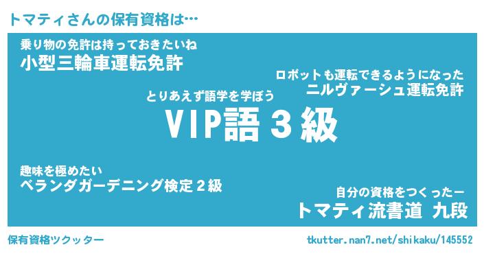 トマティさんの保有資格は… とりあえず語学を学ぼう『 VIP語3級』乗り物の免許は持っておきたいね『小型三輪車運転免許』自分の資格をつくったー『トマティ流書道 九段』 ツクッター #保有資格ツクッター http://tkutter.nan7.net/shikaku/145552/