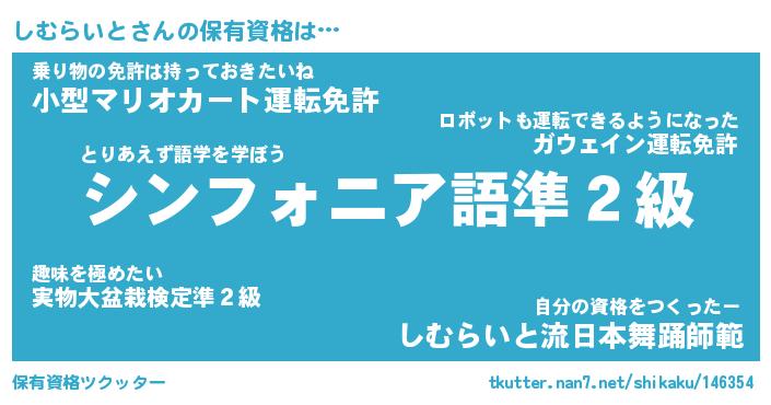 しむらいとさんの保有資格は… とりあえず語学を学ぼう『シンフォニア語準2級』乗り物の免許は持っておきたいね『小型マリオカート運転免許』自分の資格をつくったー『しむらいと流日本舞踊師範』 ツクッター #保有資格ツクッター http://tkutter.nan7.net/shikaku/146354/